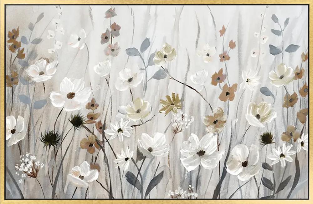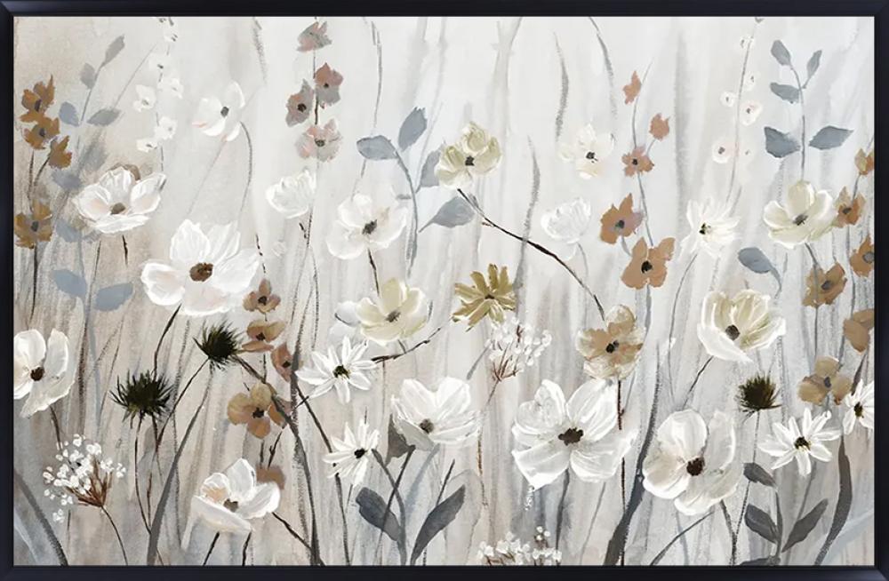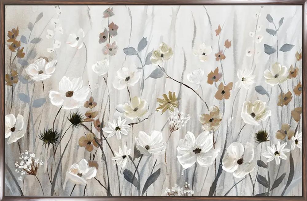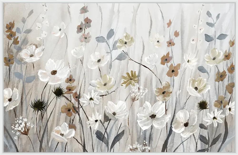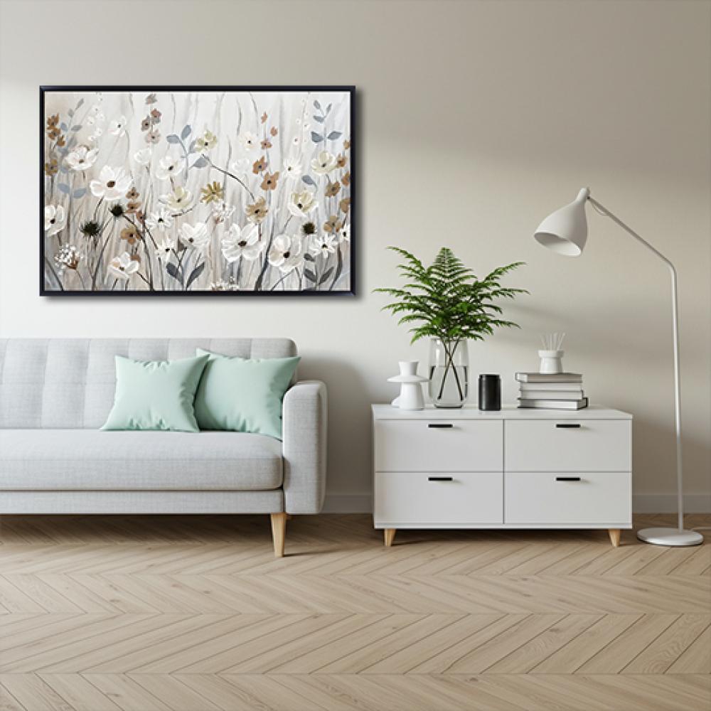 لوحة جدارية لزهور هادئة بألوان بيضاء ومحايدة